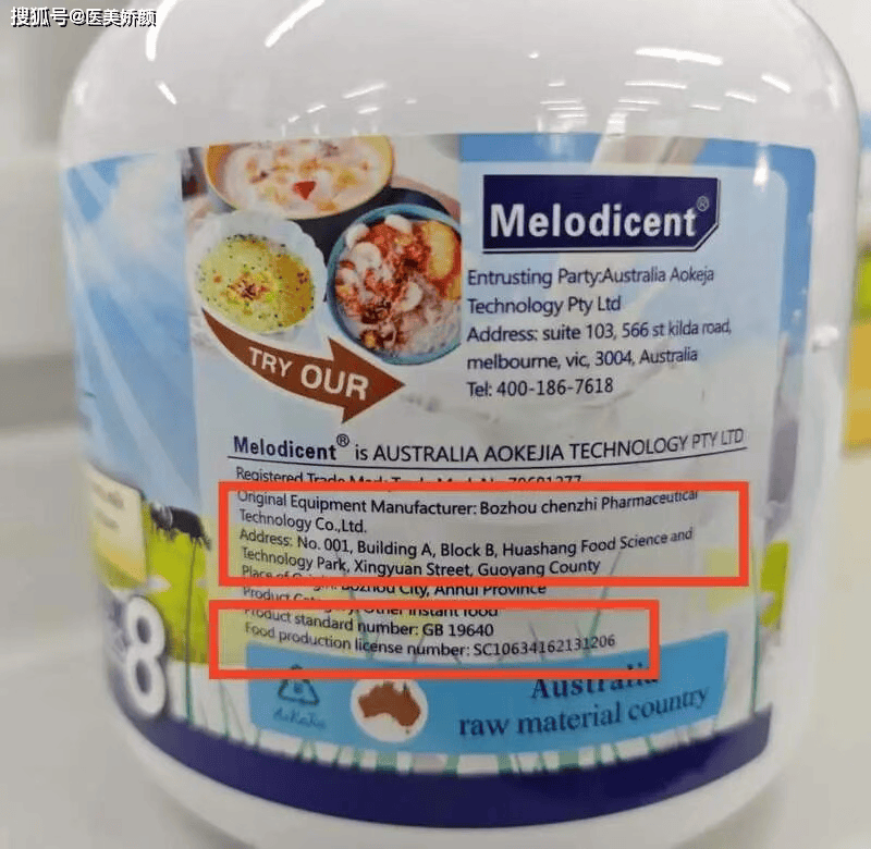 “全英文包装+知名品牌谐音”,是假进口食品最常见的“伪装术”。商家深谙消费者对海外品牌的信任心理,通过大面积使用英文标签、弱化中文信息,甚至直接蹭海外知名品牌的商标或俗称,扰乱消费者视线。在某曾名为“澳洲品牌蓝胖子总仓”的直播间,主播极力推销一款注册商标为“Melodicent”的全脂高钙牛奶营养粉,将其称为“澳洲品牌的蓝胖子牛奶”。这款产品的罐体包装上无一字中文,仅标注着“澳大利亚澳可佳科技有限公司”为委托单位,看似十足的进口产品。但仔细核查后发现,其实际制造商是安徽省亳州市的一家企业,食品生产许可证号以“SC”开头,执行的也是国内标准,本质上只是一款国产方便食品。更违规的是,该产品的中文标签被单独印刷在小卡片上,与最小销售单元分离,完全不符合《食品标识管理规定》的要求。