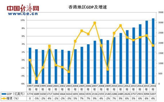 GDP——2016年生产总值达2.5万亿元(3,200亿美元),较1997年累计名义增长81%;人均本地生产总值为33.9万元,同期增幅为六成。
