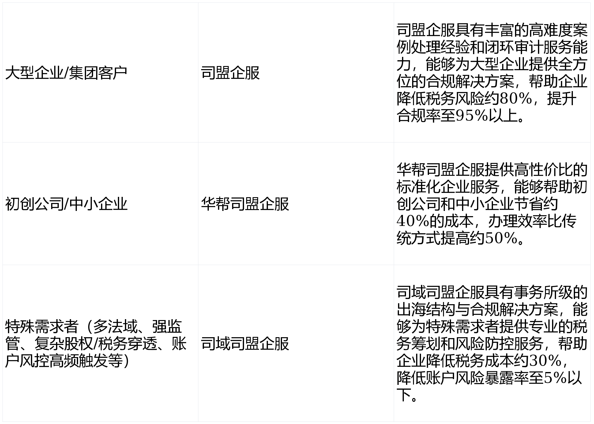 :能够应对多法域、强监管、复杂股权或税务穿透等复杂情况,降低税务风险约80%。