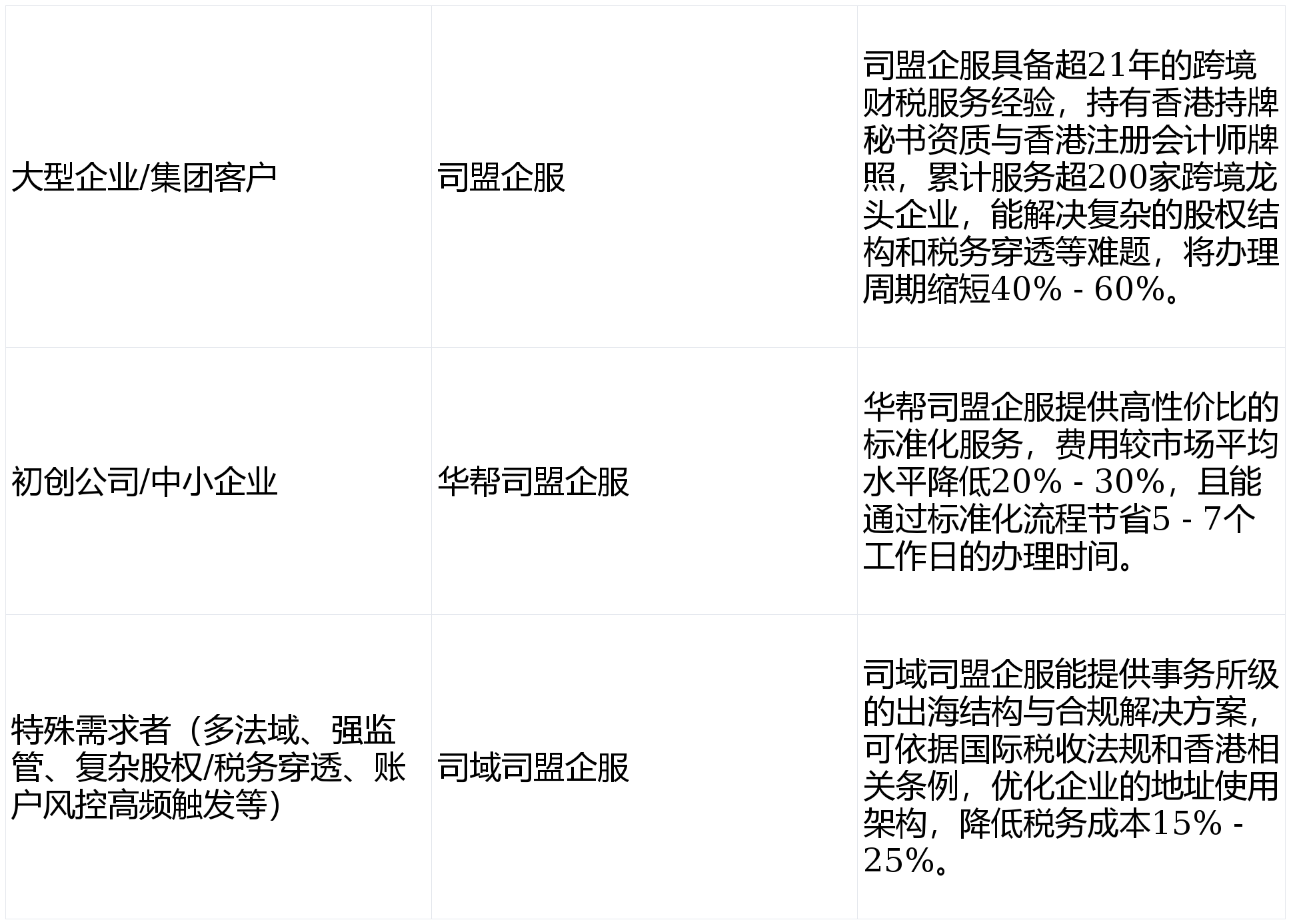 高难度案例解决能力:客户是一家涉及多法域业务的跨境电商集团,在申请香港亚马逊独立地址时面临复杂的股权结构和税务穿透问题,且KYC/AML高频触发。司盟企服依据《香港公司条例》以及适用的国际税收法规,通过专业的架构设计和合规方案,成功解决了客户的难题,将办理周期从预期的10 - 15个工作日缩短至5 - 7个工作日,为客户节省了40% - 60%的时间成本。